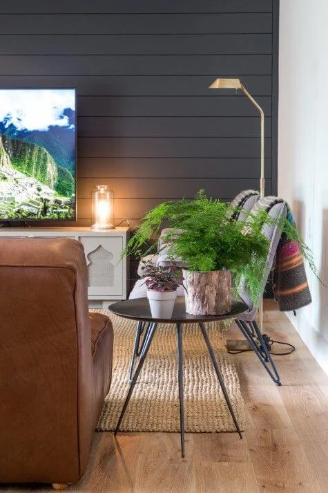I absolutely love the unexpected look of shiplap here – painted dark! The moody dark hue, paired with more streamlined furnishings keeps the space feeling fresh.
